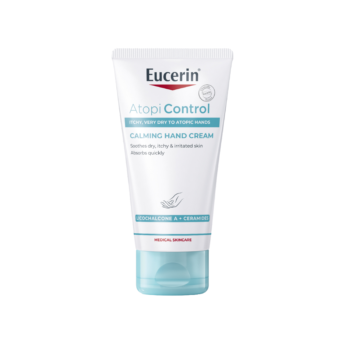 Creme de mãos apaziguante, de absorção rápida e textura não oleosa, adequado para o cuidado da pele atópica, seca, irritada, com prurido e com tendência a eczema.